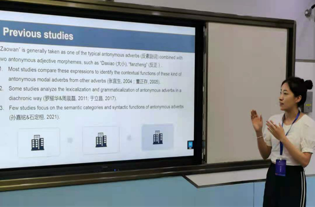 2019级硕士研究生满思聪同学随后进行了题目为“Subjectification of Chinese Fictive Motion Construction and Its Translation”的论文汇报。文章基于认知语义学的相关理论,对汉语虚拟位移构式进行具体的分析,同时结合构式语法为虚拟位移构式翻译提供理论基础。武汉理工大学beat365中文官方网站马文丽教授对其进行点评,并提出修改意见。