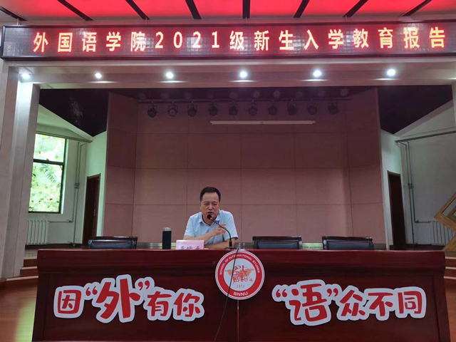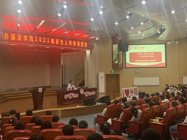 董书记首先对全体新生的到来表示热烈欢迎。接着他从发现角度谈起,鼓励同学们在大学四年间,要不断寻找自我,实现自我的锻造,成为一个理性、平和、自信、积极的自己,更要打好专业基础,成为中外文化互鉴的使者。其二,在成长层面,除了学好专业课知识外,还要努力学好人际关系、情绪管理、压力调节、人生规划和交友恋爱几门“课程”,培养自我认知能力、人际沟通能力、自我调节能力等,促进身心的全面发展。第三,在社会层面,广大青年要肩负历史使命,坚定前进信心,立大志、明大德、成大才、担大任,努力成为堪当民族复兴重任的时代新人,与时代发展同向同行,发挥外语专业的特色,生动讲好“中国故事”。