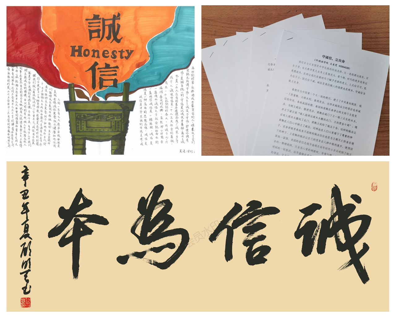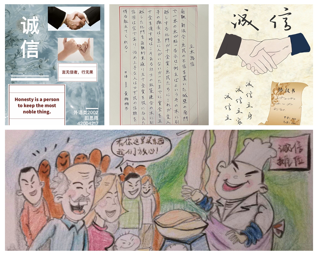 结合同学们的专业优势和个人特长,beat365中文官方网站面向全体本科生举办诚信主题作品征集活动,拍摄微视频《诚信》讲述校园中“拾金不昧”的诚信故事——经过筛选评比,最终遴选出优秀诚信主题征文5篇,书法作品7件,手抄报绘画作品6件,主题微视频短剧1部。征文作品字里行间体现出同学们对于诚信的崇尚与呼吁,硬笔书法刚劲有力,绘画海报生动形象,短剧视频见微知著。相关优秀主题作品还在学院“语心阁”宣传展板进行展览,吸引了众多学生们前来观看。学院也通过“外院见闻”官方微信,进一步对于诚信教育优秀主题作品进行宣传展示。