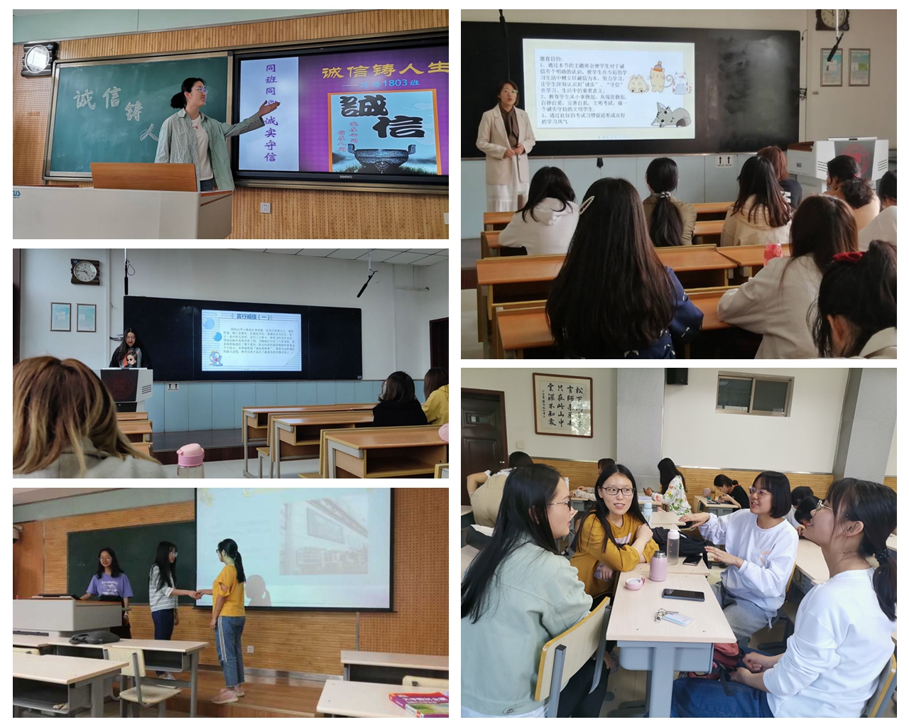 beat365中文官方网站2020级、2018级各班陆续开展了以“诚信教育”为主题的班会活动。班会形式包括诚信精神解读、典型案例分享、情景剧表演、互动交流总结等环节,同学们结合日常生活中遇到的诚信事件,学习诚信的基本内容,分享典型的诚信事件,学习先进人物的先进事迹,并且以情景剧的方式演绎失信的后果,警醒同学们懂得诚信是一个人的立身之本,认识到失信的危害,并将班会中所感所学,自觉应用到实践中去.班会活动旨在培养学生诚实待人、守信做人的优良品质,共同营造出“知信、用信、守信”的良好氛围。此外,结合学生即将迎接的考试进行考试诚信教育,使学生不仅在日常点滴生活中做到信守承诺,引导同学们共同宣誓承诺在接下来的专业四级、教师资格证等考试中,发扬诚信考试的精神,勤勤恳恳学习、规规矩矩考试、踏踏实实做人。