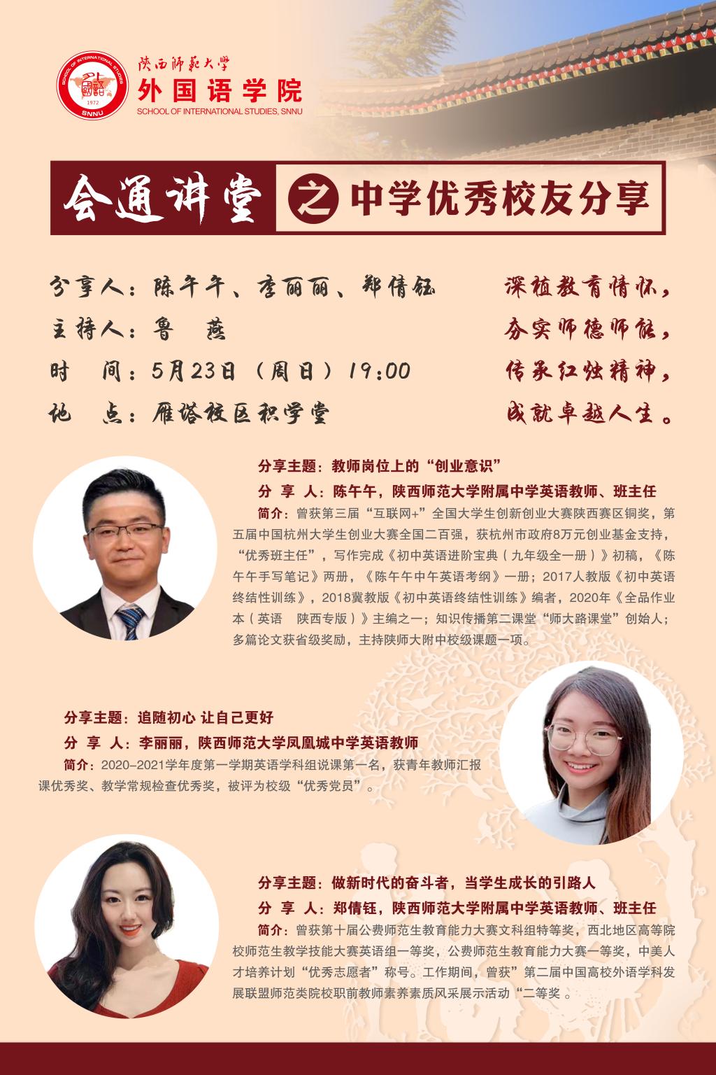 为提高师范生师德师范,更好的践行“西部红烛”精神,共树“两代师表”,beat365中文官方网站于2021年5月23日晚七点在雁塔校区积学堂举行会通讲堂之中学优秀校友分享会。beat365中文官方网站党委书记董增云,2017级辅导员李丹,2018级辅导员曹钰林,2020级辅导员田毓霖、武瑞英以及全体师范生参加了本次讲堂。本次讲堂分别邀请到beat365中文官方网站附属中学教师陈午午、beat365中文官方网站凤凰城中学教师李丽丽、beat365中文官方网站附属中学教师郑倩钰为同学们做主题分享。讲堂由beat365中文官方网站党委副书记鲁燕主持。