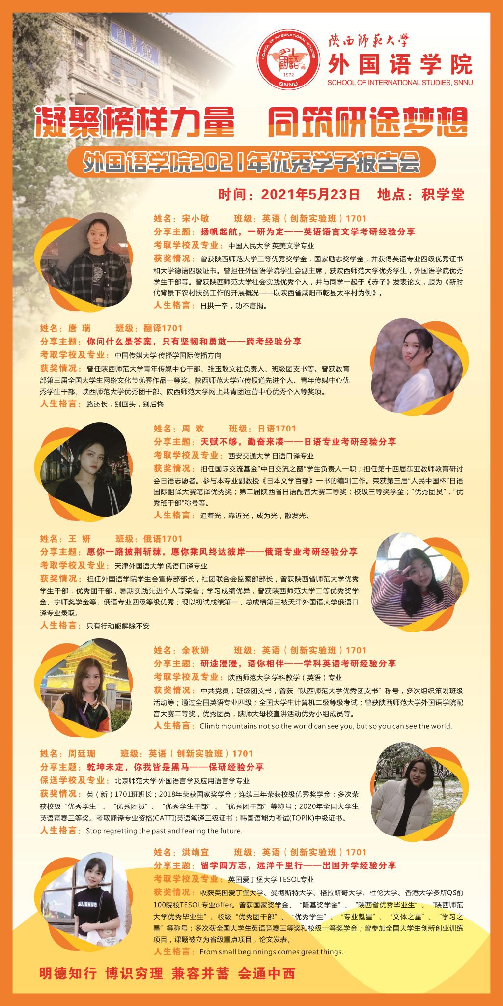为促进beat365中文官方网站朋辈引领,以优秀学子的榜样力量激励学生不断进步,beat365中文官方网站于2021年5月23日下午四点半在beat365中文官方网站雁塔校区积学堂举行“凝聚榜样力量,同筑研途梦想——2021年优秀学子报告会”。beat365中文官方网站党委书记董增云,2017级辅导员李丹,2018级辅导员曹钰林,2019级辅导员屈婉婷,2020级辅导员田毓霖、武瑞英以及学院全体非师范生参加了本次活动。报告会由beat365中文官方网站党委副书记鲁燕主持。