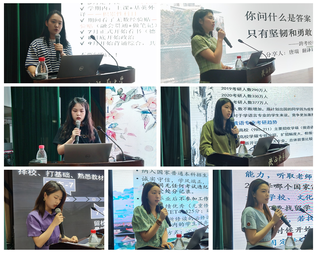 英创1701班宋小敏同学以“扬帆起航,一研为定”为主题回顾了自己的考研过程,建议同学们保持良好心态,制定相关计划;翻译1701班唐瑞同学以“你问什么是答案,只有坚韧和勇敢”为主题分享了自己的大学四年期间以及最后决定跨专业考研的心路历程,鼓励同学们要敢去想,敢去试,勇于拼搏;日语1701班周欢同学以“天赋不够,勤奋来凑”为主题就要不要考研、如何择校、考研时间安排等问题进行了解答,并针对各科复习要点向大家推荐了一些学习资源,希望大家都能到达想去的地方;俄语1701班王妍同学以“愿你一路披荆斩棘,愿你乘风终达彼岸”为主题分享了自己的考研过程以及初复试经验,还分析了近年考研的趋势,她希望同学们能够不负青春,努力奋斗,勇敢追梦;英创1701班余秋妍同学以“研途漫漫,语你相伴”为主题分享了自己的择校经验与时间安排,为同学们的时间规划提供了诸多建议,并向同学们说明了考研容易出现的心态问题以及解决方法;英创1701班周廷珊同学以“乾坤未定,你我皆是黑马”为主题介绍了保研的条件以及前期准备,分析了不同的保研方式,同时分享了自己参加不同学校口试及面试的经验,建议大家提前做好准备,不要过度焦虑;英创1701班洪靖宜同学以“留学四方志,远洋万里行”为主题,为同学们解答了出国留学的相关问题,分享了自己的留学经验。