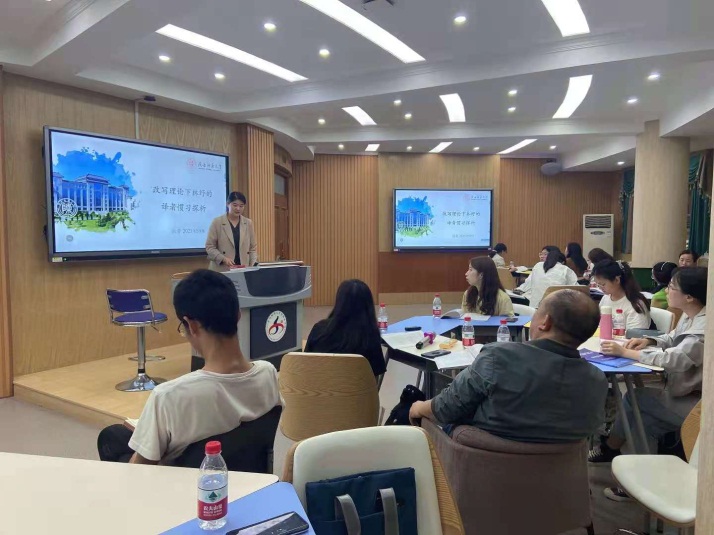8日下午,其他参会代表在分论坛和译学沙龙分会场展开深入交流。“理论翻译学”论坛主要探讨了译思与译论的关系、中国特色文化翻译协调理论以及中国译论演化等议题。“方法与方法论”论坛结合具体的翻译实践研究,就国家翻译实践论、正确的翻译观和翻译学研究方法论等作了主题报告。“翻译史”论坛就当代中国翻译理论的观念嬗变、翻译史研究方法论与模式、特定时期翻译史研究成果、中国语境下具备中国特色的翻译现象等进行了深入探讨。特邀嘉宾对报告人的发言进行了精彩点评。其中,beat3652019级研究生—张静同学做了题为“改写理论下林纾的译者惯习探析”的汇报,文章具体从改写理论入手对林纾译者惯习的养成影响进行了探究,并最后升华为对中国文化外译提出浅见,具有现实研究意义。湖北经济学院beat365中文官方网站副院长吴长青及北京大学博士生胡圆圆对其进行点评,并提出完善意见。