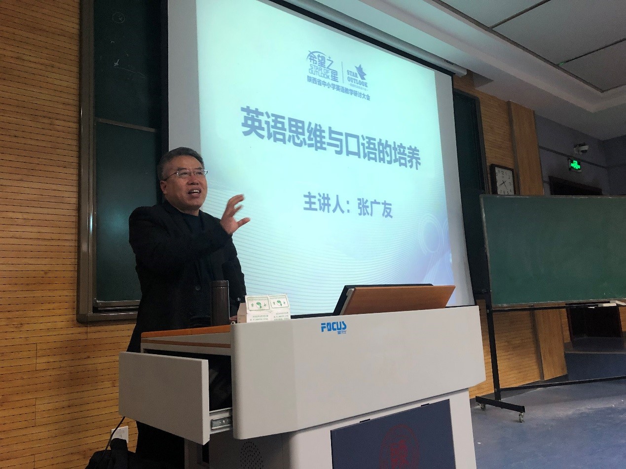 讲座主题是英语思维与口语的培养。首先张老师向同学们提出一个问题:你为什么学习英语?现场同学积极响应,张老师以此开始今天的讲座。他分享了当年在师大的学习时光以及他这39年来深入基础外语教育的经历。结合自己丰富的教学经验,他送给同学们三个词:English——精通英语;PCK——精通学科教学知识;Policy——关注并研究国家和地方的教学标准。