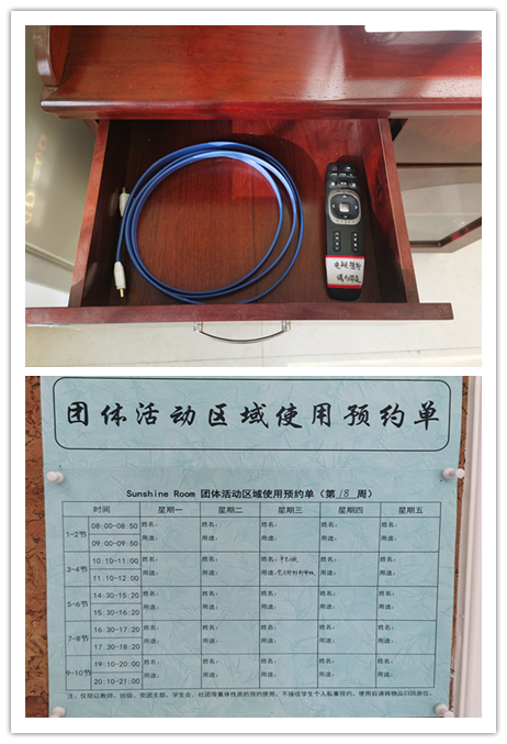 个案咨询室配备沙发,茶几和档案柜,主要用于教师与学生个体单独谈心谈话使用。个体咨询室钥匙归放在学工组6111办公室,如需使用,请提前拿取钥匙并及时归还。