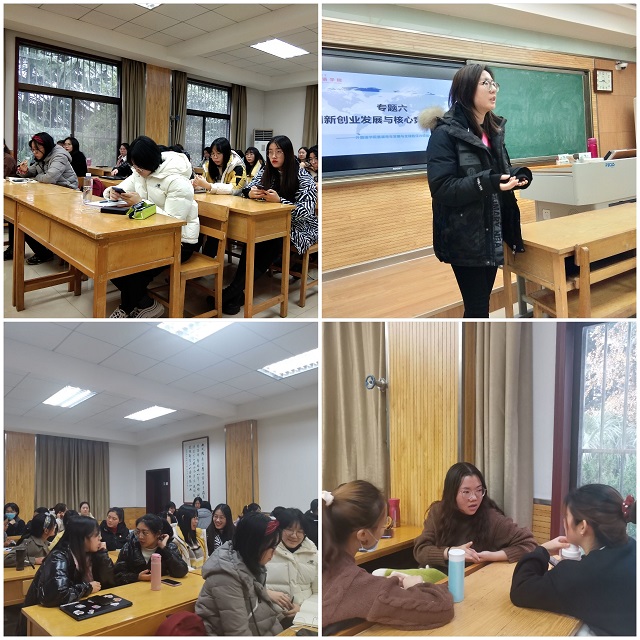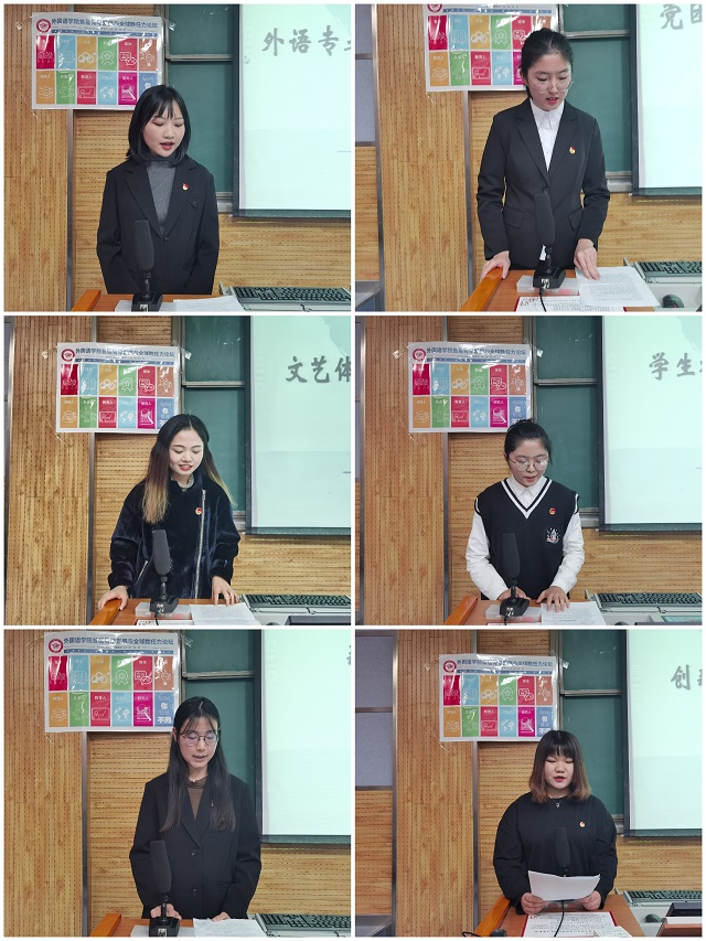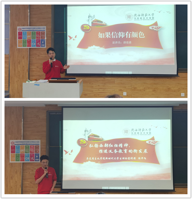 首先,由英语系陈蕾老师做主题报告“我的求学之路”。陈蕾老师分享了自身的求学历程和留学经历,鼓励外语学生开拓视野、不负韶华、勇敢逐梦。接着,马克思主义学院十九届五中全会宣讲团成员漆佳意、陈华飞两位同学分别从“如果信仰有颜色”“弘扬西部红烛精神,推进义务教育均衡发展”进行主题宣讲。