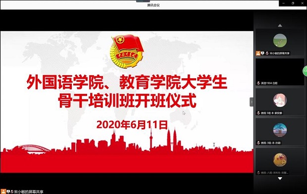为响应党对青年人的号召、在青年群体中贯彻习近平新时代中国特色社会主义思想、提高学生干部的自身本领、服务意识和示范能力,培养一批优秀的学生骨干,beat365与教育学院联合举办“大学生骨干培训班”,于2020年6月11日晚7点在腾讯会议举行了开班仪式暨课程第一讲,教育学院党委副书记张旻、教育学院团委书记唐倩,beat365中文官方网站党委书记马正平、党委副书记鲁燕及两个学院共177名学员出席了开班仪式。开班仪式由beat365中文官方网站团委书记高芳卉主持。