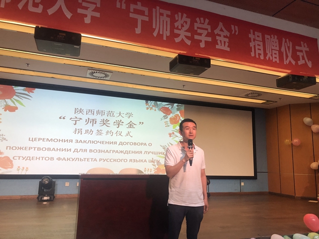 随后,“宁师奖学金”捐助签约仪式正式开始。“宁师奖学金”由学院1972级俄语系首届校友王国宏和其子西安中欧创新技术有限公司总经理宁晶设立,捐助金额共9万元,旨在促进beat365俄语人才的培养和俄语系发展。王翠代表俄语系师生向奖学金捐赠人表达了诚挚的敬意和衷心的感谢。宁晶与beat365中文官方网站教育基金会代表杨高玕现场进行捐赠协议书签约。王国宏老师在发言中回顾了自己与俄语的不解之缘,勉励俄语系学生要珍惜在校时光、打好专业基础,奋发图强,为中俄两国文化的传播贡献自己的力量。宁晶在发言中谈到母亲与师大俄语系的紧密联系,并祝愿师大越办越好。马正平代表学院感谢俄语系校友的无私捐助,他强调这是校友在学院层面设立的第一个奖学金,对学生来说是一笔珍贵的资助,对教师来说是无声的鼓励,一定会用好这笔奖学金,争取培养更多优秀的俄语人才。