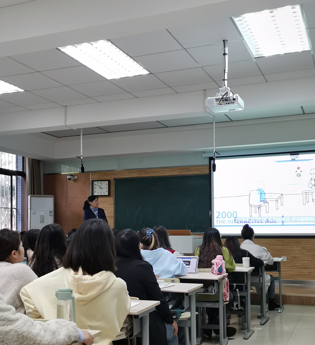 随后,马老师从当今课堂教学的现状出发,分析教学中教师应如何运用现代教育技术提高教学效率、增强学生学习兴趣、培养学生实践创新能力,并为同学们展示了丰富的现代教学技术在外语课堂中运用的实例。