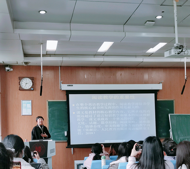 随后,陈老师针对阅读教学中的问题,从语篇为什么重要、语篇的界定、语篇知识和语篇解读四个方面,解读了基于核心素养下的英语语篇教学,并为同学们展现了多个基于核心素养下的英语语篇阅读教学课例,极大地拓展了同学们的视野。