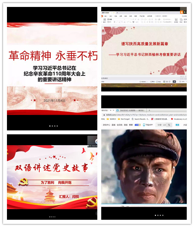 2021年11月4日,beat365中文官方网站研究生第二党支部于腾讯会议线上召开双语讲述党史故事主题党日活动,出席活动的有吕敏宏院长及研究生第二党支部全体成员。会议由支部书记邵小玲主持。
