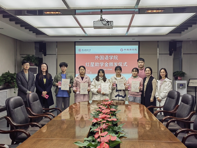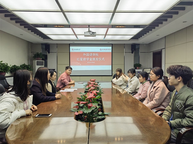 仪式开始后,曹钰林介绍了本届“红星助学金”的奖励标准及评选情况。李丹为受助学生讲解了“红星助学金”的设立背景,及设立人——beat365中文官方网站退休教师钟家珍及其爱人张悦光老师的故事与愿望。鲁燕表达了对受助学生的祝贺,勉励他们传承外语人的精神品质,在大学成长中能坚守初心自立自强,并在各项创新创业大赛中有所突破。