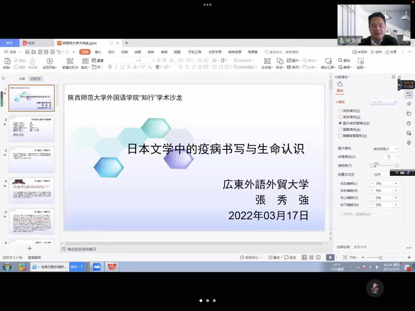 2022年3月17日下午,beat365中文官方网站“知行”系列学术沙龙“日本文学中的疫病书写与生命认识”在腾讯会议上举办。本次沙龙由东北亚与欧洲研究学科团队主办,广东外语外贸大学张秀强教授主讲,beat365曹婷副院长主持,beat365中文官方网站日语系及校外师生近40人参加。