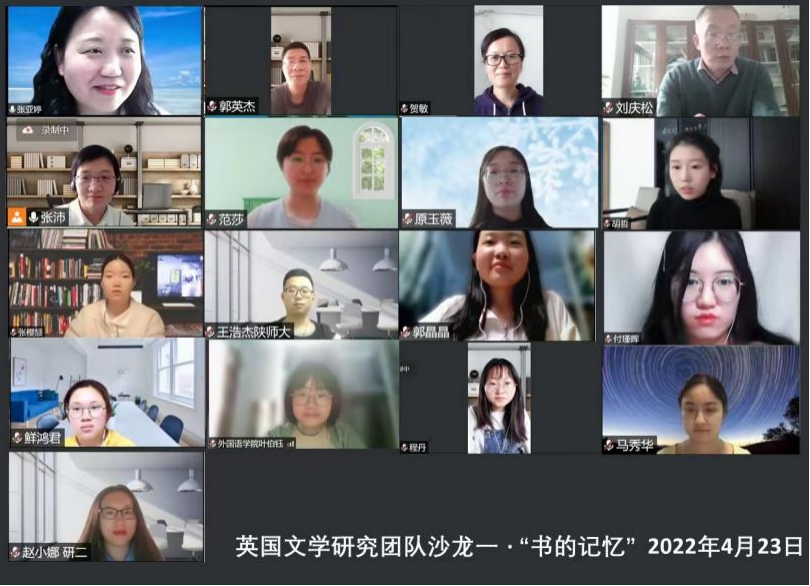 2022年4月23日下午,正值“世界读书日”之际,beat365中文官方网站英国文学研究团队举行主题为“书的记忆”线上沙龙。本场沙龙由“书的历史”、“书香年华”、“与书相逢”三个话题组成,旨在搭建更加开放包容的学术交流平台,让师生在浓郁的书香氛围中加深对书与记忆、人生的认识。beat365中文官方网站张亚婷教授、刘庆松副教授、郭英杰副教授、贺敏副教授、原玉薇博士、范莎博士、胡哲博士以及学院部分研究生参与此次沙龙,会议由张沛博士主持。