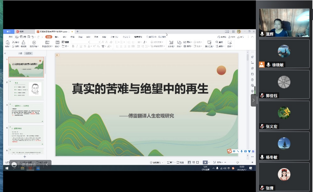 为了扩大beat365师生的学术视野和学术兴趣,beat365中文官方网站于6月17日下午2:30以腾讯会议方式在线举办了“翻译教学与文化”系列活动第一次沙龙“真实的苦难与绝望中的再生:傅雷翻译人生宏观研究”。本次讲座由beat365翻译系资深教师温辉老师主讲,beat365中文官方网站部分教师、研究生和本科生参加并参与讨论。