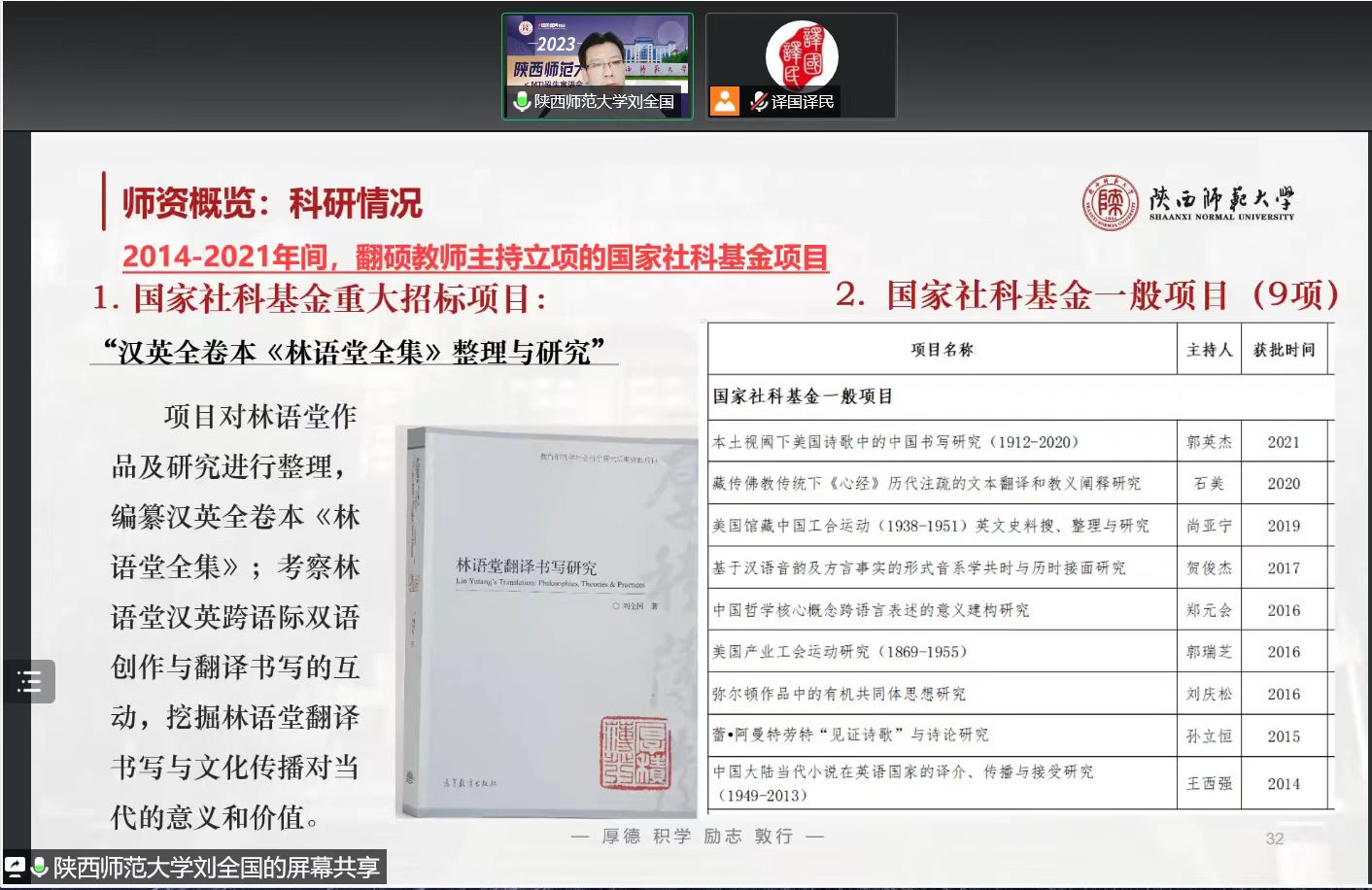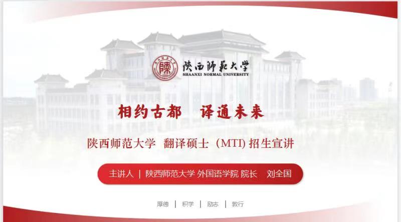 应“译国译民”教育平台邀请,beat365院长、MTI中心主任刘全国教授于2022年8月16日下午15:00做了题为“相约古都 译通未来”的MTI在线招生宣讲报告。全国多所院校在读本科生、多家翻译公司总经理和多所高校MTI负责人等200余人参加了宣讲会,并参与互动提问。