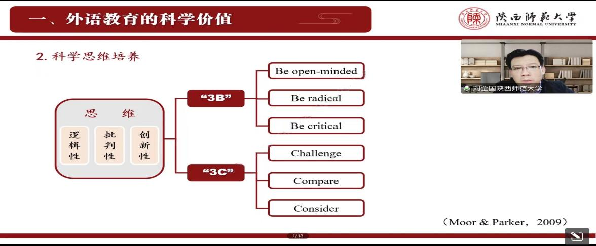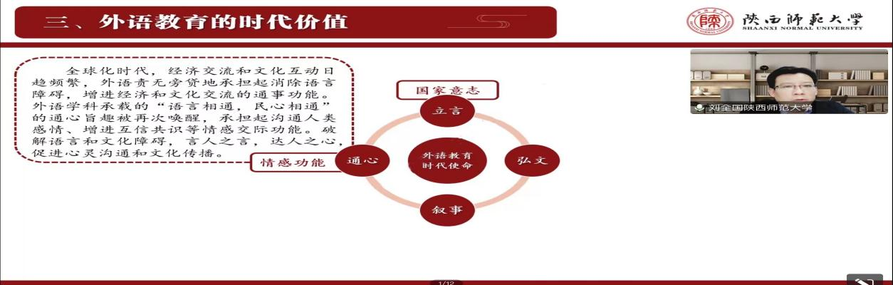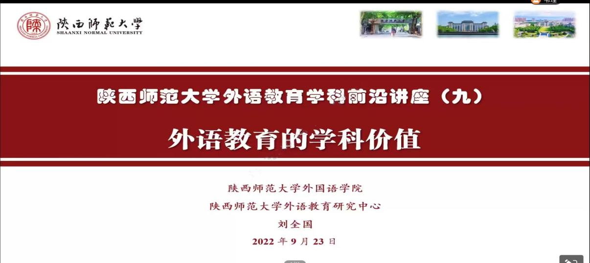 为了提高beat365学科教学(英语)专业研究生的外语教学能力,加强学生对外语教学学科价值的理解,beat365中文官方网站于9月23日下午在腾讯会议线上开展了外语教育学科前沿讲座第九讲——外语教育的学科价值。本次讲座由beat365中文官方网站院长刘全国教授主讲,会议由韦理老师主持。beat365中文官方网站2022级和2021级学科教学(英语)专业教育硕士聆听了讲座。