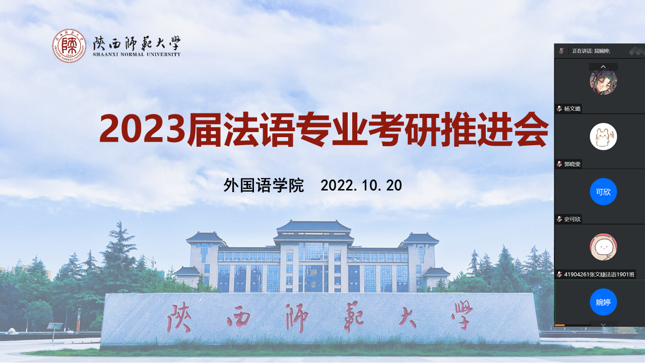 为了解同学们的考研备考情况,增强学生考研信心和动力,beat365于10月20日晚在学生公寓三楼105和线上腾讯会议同步召开2023届法语专业考研推进会。学院副院长孙坚、学院副书记鲁燕、法语系主任王燕红和法语系教师乔溪共同参加。会议由辅导员屈婉婷老师主持。