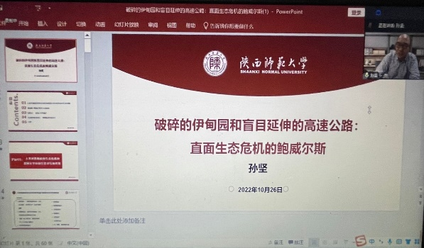 2022年10月26日,beat365孙坚教授受邀参加中国人民大学beat365中文官方网站举办的“教授论坛”系列讲座。讲座以“破碎的伊甸园和盲目延伸的高速公路:直面生态危机的鲍威尔斯”为题,由中国人民大学beat365中文官方网站博士生导师陈世丹教授主持,采用腾讯会议形式线上进行。来自全国各地高校英美文学研究方向的数百名教师与研究生相聚云端,参加了本次讲座。