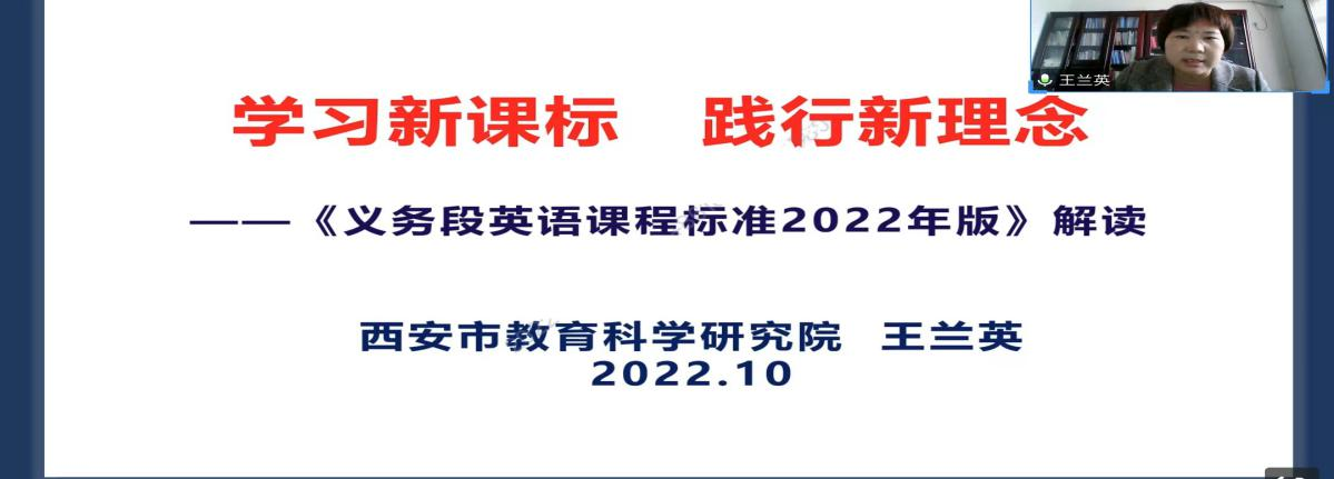 课程标准是指导教师教学最重要的工作指南。为了提高教育硕士的外语教学能力,beat365中文官方网站于10月14日下午在腾讯会议线上进行了基础教育外语教学专题研究系列讲座第八讲——《义务教育英语课程(2022版)》标准解读。本次讲座由西安市教育科学研究院中学英语教研员王兰英老师主讲,韦理老师主持。beat365中文官方网站2022级学科教学(英语)专业教育硕士参与聆听。