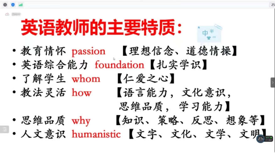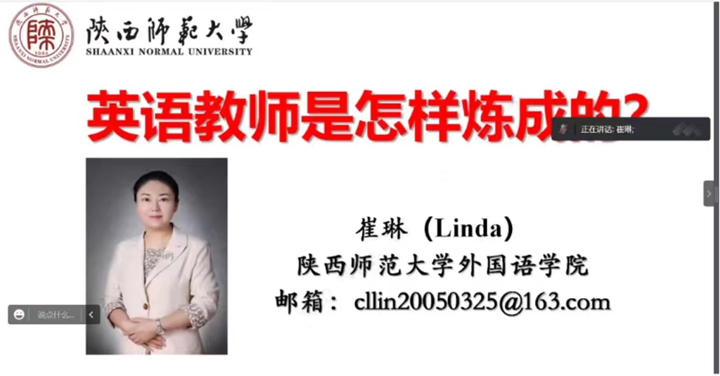 为了提高beat365学科教学(英语)专业研究生的外语教学能力,加强学生对外语教学学科价值的理解,beat365中文官方网站于10月21日下午在腾讯会议线上进行了外语教育学科前沿讲座第十讲——英语教师是怎样炼成的?本次讲座由beat365中文官方网站崔琳老师主讲,韦理老师主持。beat365中文官方网站2022级学科教学(英语)专业教育硕士聆听了讲座。