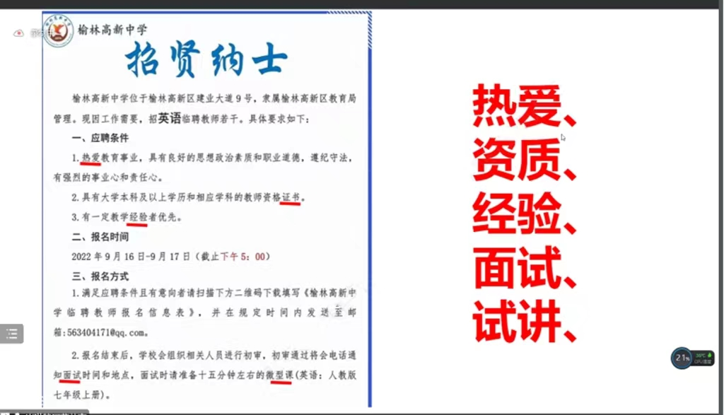 接着,崔老师通过简单的模拟中小学教师招聘面试,引导大家思考作为一名预备人民教师,我们应该具备哪些素质以及在面试过程中如何更好地表现自己。 崔老师讲到,作为一名英语教师,除了具备扎实的学识,还需要具有浓厚的教育情怀,明确自己的理想信念,热爱教育事业,积极奉献到教育事业与课堂中去。在教学中要做到以仁爱之心对待学生,积极主动了解学生,努力提高自己的核心素养,灵活运用各种教学方法,提高课堂质量与教师教育教学水平等。