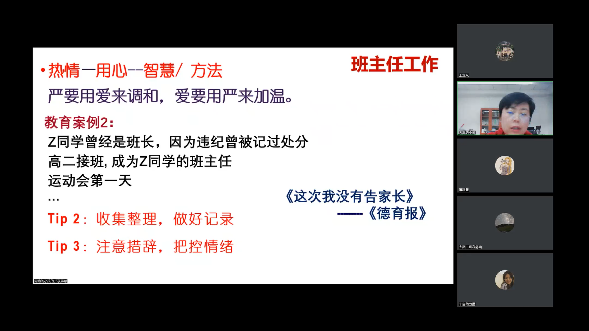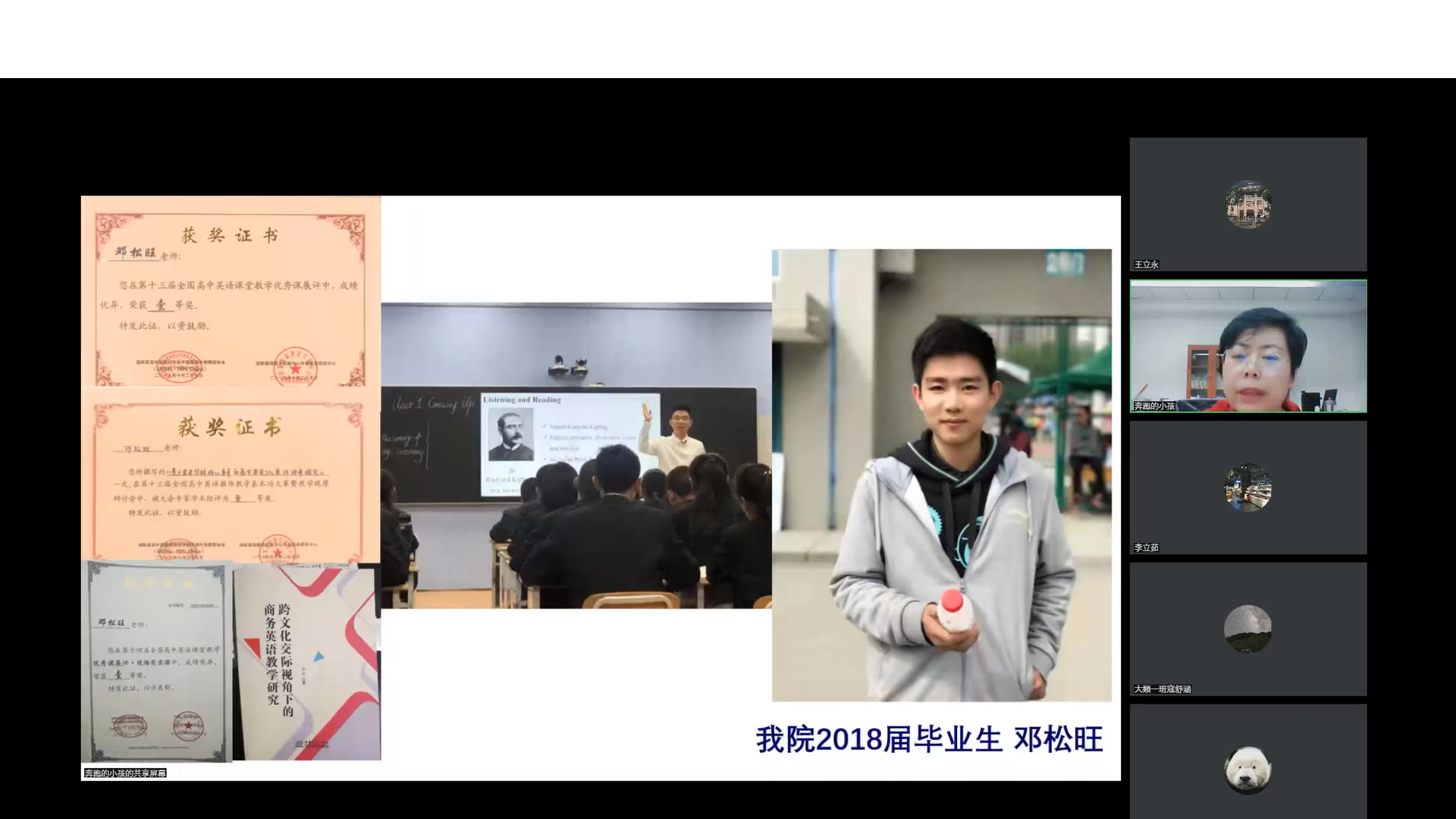 2022年11月11日晚,beat365中文官方网站一流本科专业建设论坛之与基础教育名师面对面活动邀请beat3652022届优秀校友、山西省实验中学高级教师王瑞敬通过腾讯会议就公费师范生的求职面试、专业能力提升和班级管理艺术开展专题讲座。本次讲座由英语系副主任王立永副教授主持,李立茹老师和200余名公费师范生参加了讲座。