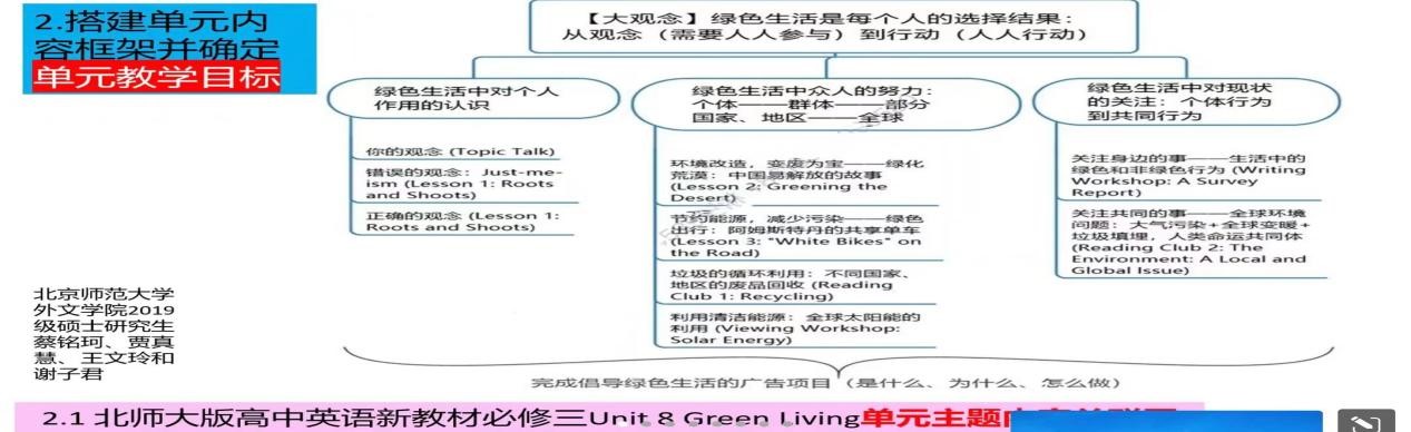 教师在进行备课时,需要从课程大观念出发,明确单元设计的指导思想,理清单元教学的核心理念,基于大观念对单元内课时目标进行整体规划,基于规划设计各语篇的教学活动,从而引导学生从不同侧面探究主题意义并建构小观念,最终形成单元大观念。王老师还强调要同步拟定课堂评价的方式和具体的评价要点,推进教、学、评一体化。