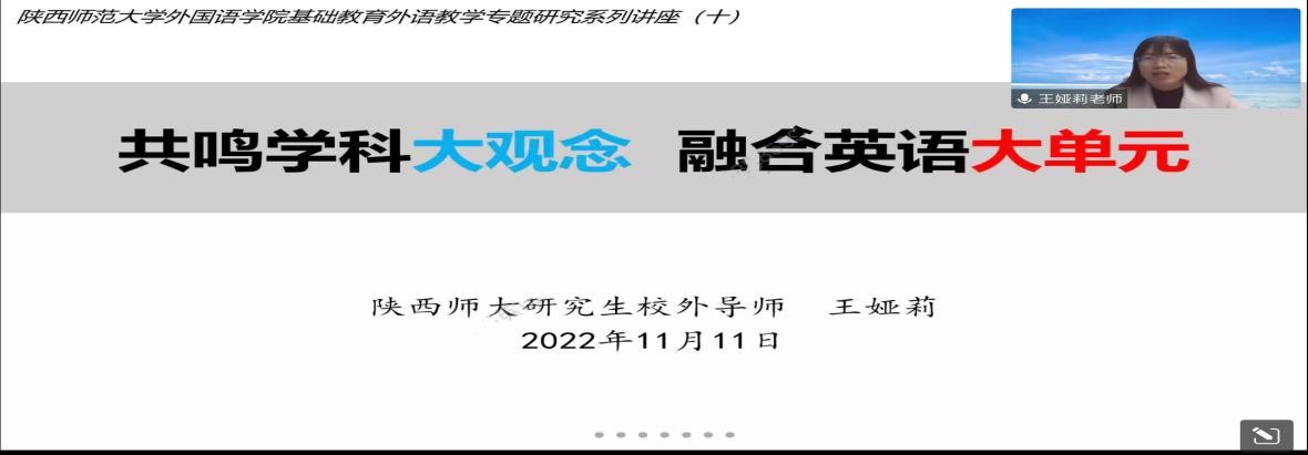 “大单元教学”是新课标提出的新概念。作为未来的一线教师,掌握最先进的教学理念,是职责也是义务,更是教师专业发展中必不可少的一步。为了提高beat365学科教学(英语)专业教育硕士的外语教学能力,beat365中文官方网站于11月11日下午在腾讯会议线上开展了基础教育外语教学专题研究系列讲座第十讲——共鸣学科大观念,融合英语大单元。本次讲座由全国优秀教师、陕西省教学能手、beat365中文官方网站研究生校外导师王娅莉老师主讲,由韦理老师主持。beat365中文官方网站2022级学科教学(英语)专业研究生参与聆听。