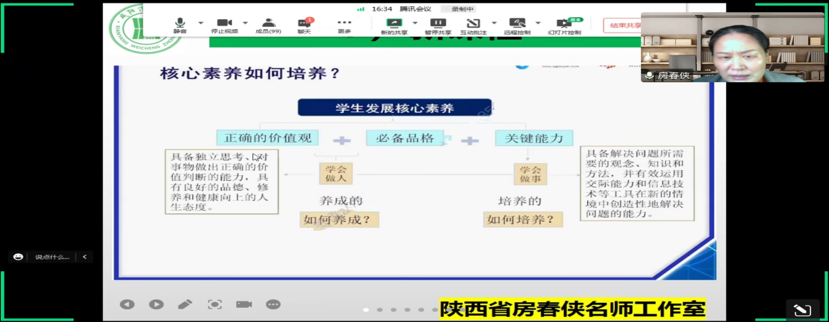 房老师从三个层面展开讲座:新课程、新高考、新教材。首先,房老师介绍了核心素养的概念,以及核心素养四要素:语言能力、文化意识、思维品质、学习能力。随后对核心素养的培养进行详细介绍。房老师让同学们对这个问题进行思考,与同学们在评论区进行互动,并从三个角度阐明核心素养的培养:正确的价值观、必备品格、关键能力。她结合不同老师的课例,使同学们对核心素养有了更加深刻的认识。随后房老师从新高考出发,谈到“高考改革的昨天、今天、明天”,再到新教材的改革,强调了“以学定教”、“以学为本”,使同学们对新教材有了全新的认识。