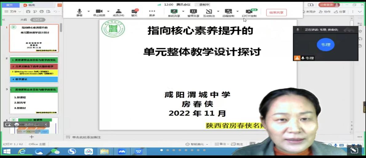 随着新课程新教材实施进程的推进,课程建设起着举足轻重的作用。基于核心素养的新课程要求树立新的学生观,以学生为本,培养学生终身发展的所需技能。英语学科核心素养靠单一、零散、局部的课程是无法实现的,新课程的实施需要依托单元教学实现,必须用整体的、连贯的、结构化的课程支撑,基于整体单元教学,落实立德树人的根本任务。为了提高beat365学科教学(英语)专业教育硕士的外语教学能力,学院于11月25日下午在腾讯会议线上开展了基础教育外语教学专题研究系列讲座第十一讲——指向核心素养提升的单元整体教学设计探讨。本次讲座由咸阳渭城中学高级教师、陕师大2013届教育硕士、陕西省省级名师、省级带头人、陕西省教学能手、全国英语优质课一等奖房春侠老师主讲,韦理老师主持。beat365中文官方网站2022级学科教学(英语)专业教育硕士参与聆听。