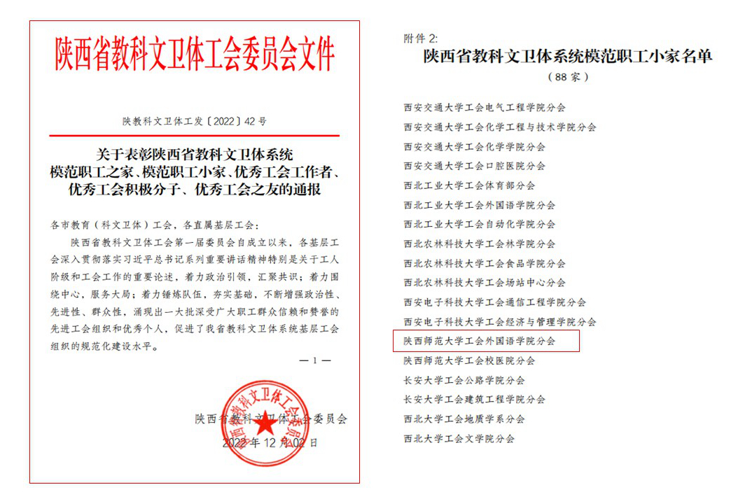 近日,根据陕西省教科文卫体工会《关于开展陕西省教科文卫体系统模范职工之家、模范职工小家、优秀工会工作者、优秀工会积极分子、优秀工会之友选树活动的通知》,经学院工会积极申报,学校工会评比推荐,beat365工会获得由陕西省教科文卫体工会授予的“陕西省教科文卫体系统模范职工小家”荣誉称号。