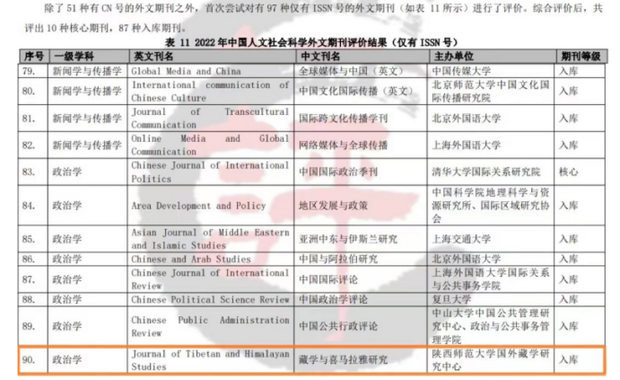 《AMI综合评价报告》是目前国内学界主要的核心期刊目录之一,主要从吸引力、管理力和影响力三个层次对期刊进行评价,实行一票否决制,具有高度的学术权威性和社会认可度。自2014年起,中国社会科学评价研究院每四年开展一次期刊评价工作。2022年,在第三轮期刊评价工作中,对中国人文社会科学33个学科类的1924种老牌刊、117种新创刊和148种外文刊,共计2189种期刊进行了评价。《Journal of Tibetan and Himalayan Studies》被列入148种外文刊之中。本轮还新增学术集刊评价,403种集刊中共有48种入选本次评价,《跨语言文化研究》即为其中之一。