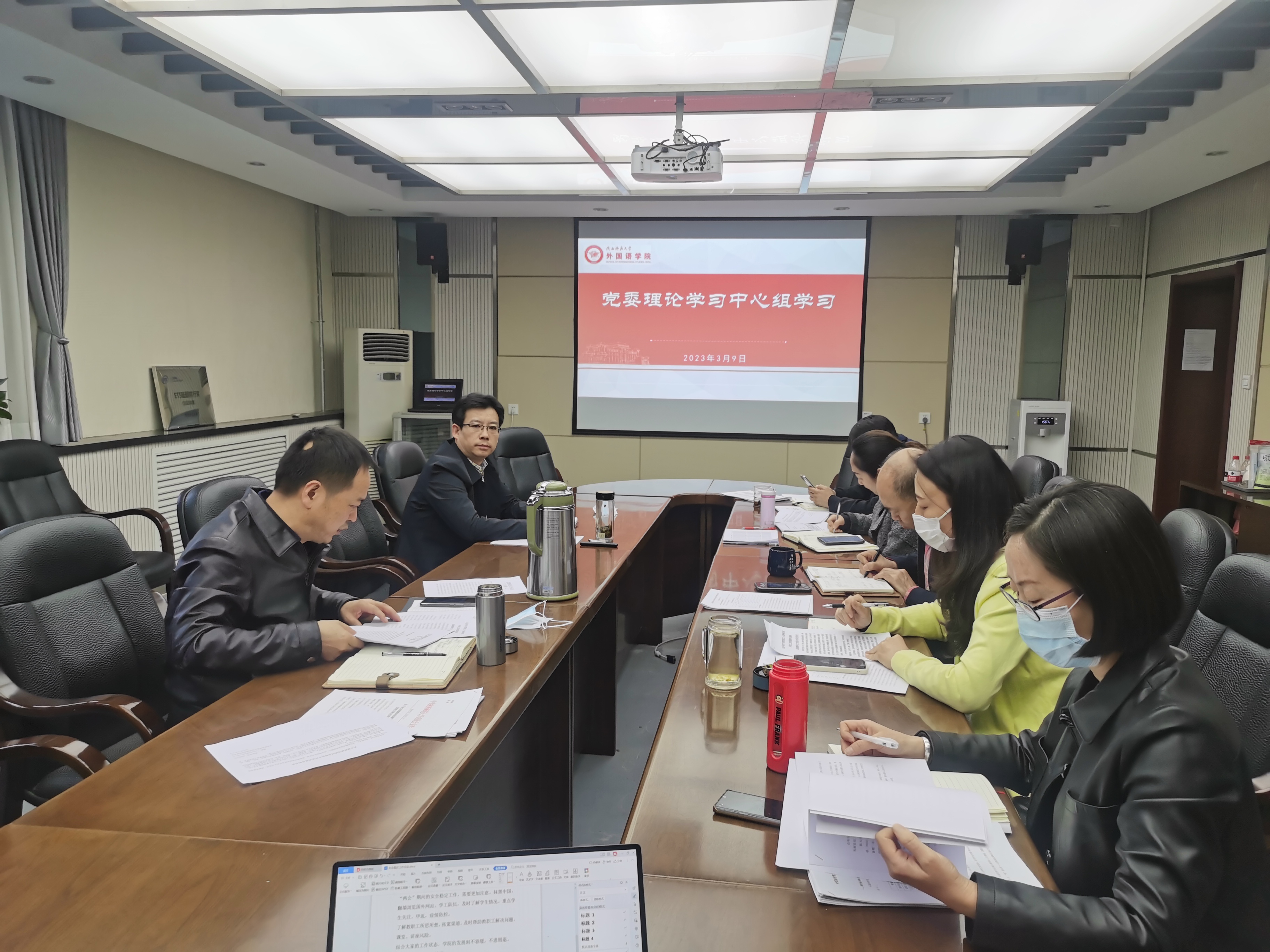 3月9日下午5点,beat365党委在教学六楼学院会议室召开了理论学习中心组会议。学院党委书记董增云,院长刘全国,党委副书记鲁燕,副院长孙坚、吕敏宏、曹婷、王幸生参加了此次会议。学习由学院党委书记董增云主持。