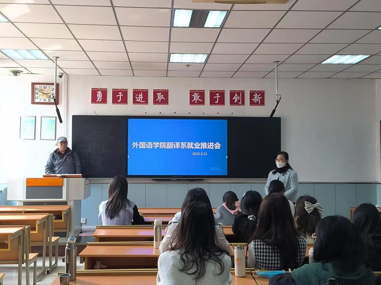为切实做好beat365本科生就业指导工作,精准掌握2023届本科生翻译专业毕业生求职进展,beat365于3月21日下午在教学四楼4102召开2023届翻译专业学生就业工作推进会。学院副院长孙坚、翻译系主任操林英、辅导员屈婉婷与全体翻译专业2023届毕业生共同参加。