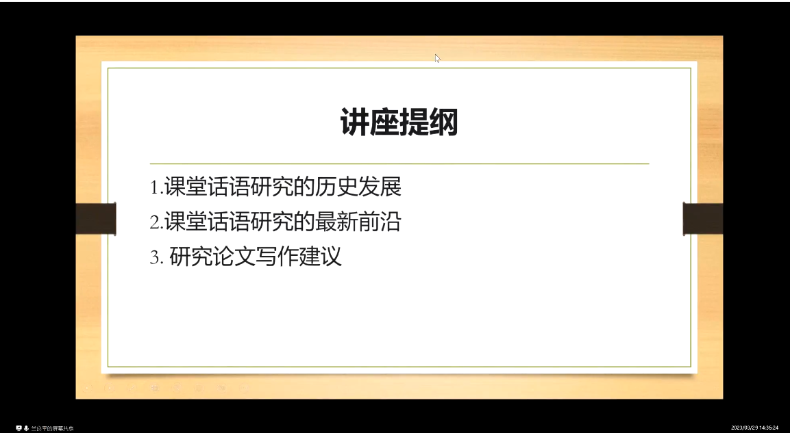本次讲座分为三大部分:课堂话语研究的历史发展、课堂话语研究的最新前沿和研究论文写作建议。兰教授将第一部分的课堂话语的历史发展分为互动分析、伯明翰话语分析、教育分析和会话分析四个阶段,用具体例子对每个阶段进行详细解释并指出其优缺点。