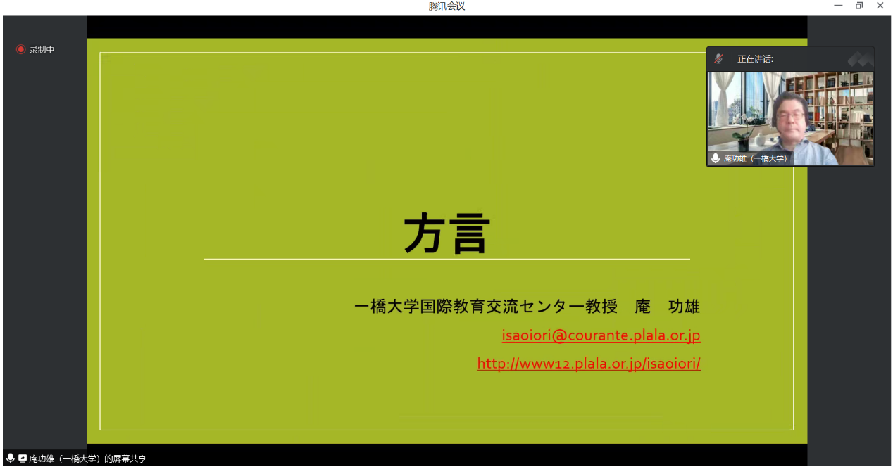 讲座伊始,庵功雄教授首先介绍了日语中的「方言」,江户时代存在着多种多样的语言,明治维新后,在建立中央集权国家的过程中,制定了「標準語」,即共通的语言。同时庵教授表示,日语的方言显示出东西的对立,例如,在表示否定时,东部使用「~ない」,西部则使用「~ず」的表达。除此之外,庵教授还从「アスペクト」「自発表現」等方面介绍了共通语言与方言体系的不同。