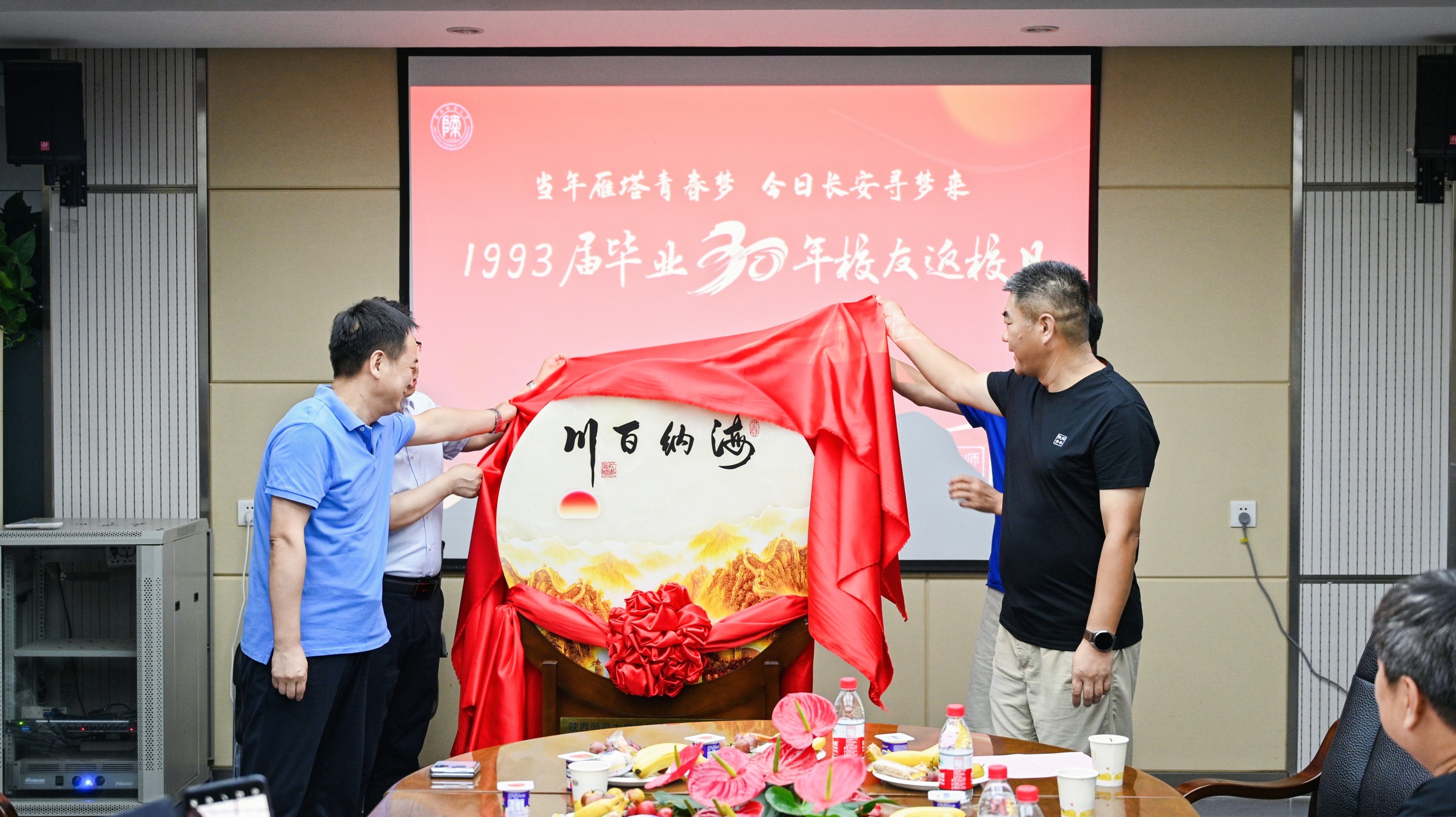 随后,1993届校友代表向学院赠送了纪念牌礼物。纪念牌正面写有“海纳百川”几个大字,背面印有1993届校友当年的毕业照,象征着1993届校友难忘母校,永记师恩。校友代表还向时任教师赠送了鲜花。学院也向校友代表回赠了礼物。
