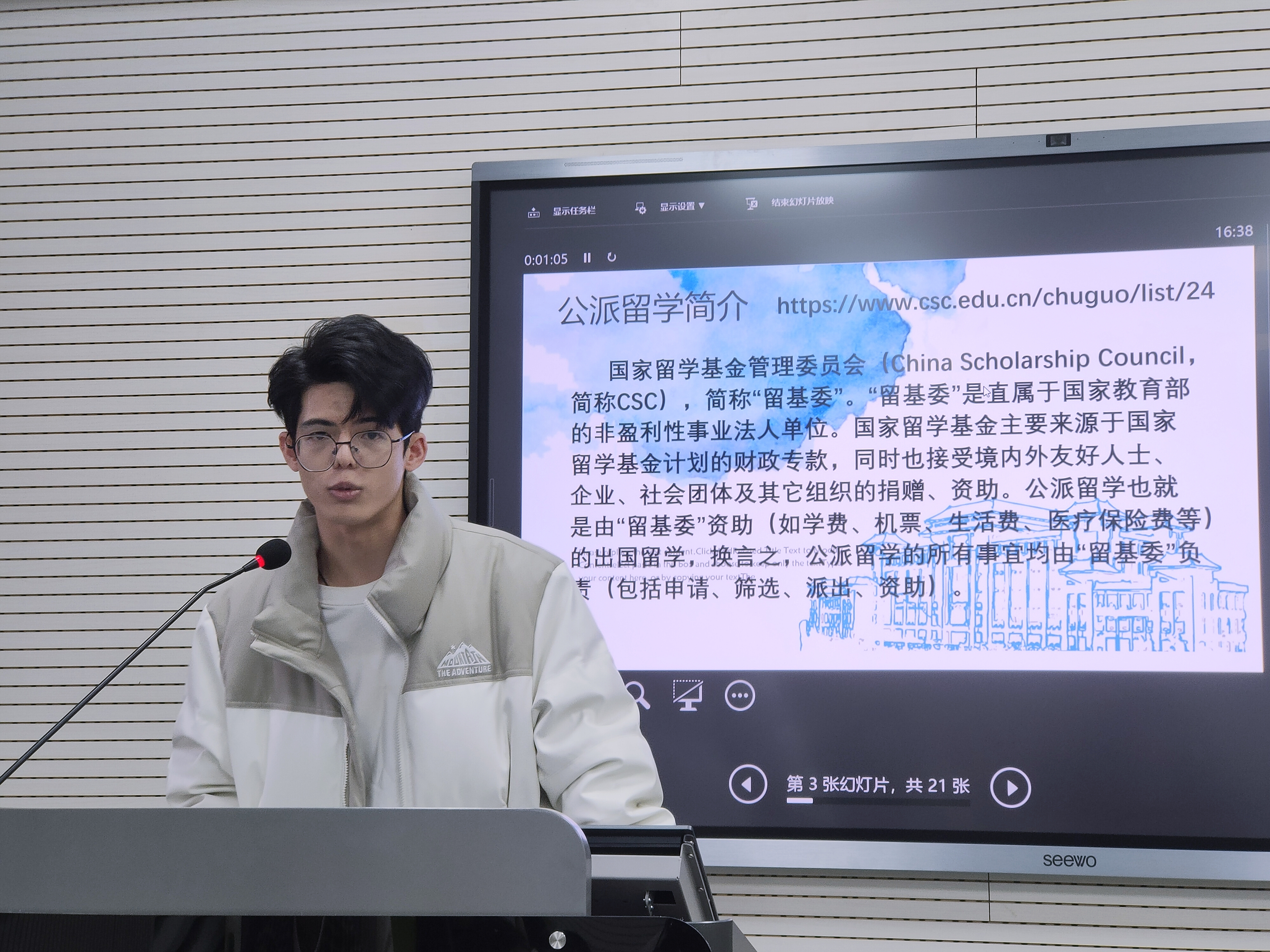 田卓同学以《开拓视野,感知文化》为题作公派留学经验分享。他细致讲解了公派留学类别、留学时限、资助数额、申请流程等信息,并结合自身留学经历,提出相关注意事项。田卓同学展示了摄影作品,使在座观众领略到俄罗斯风光,了解留学生的日常生活。最后,他鼓励同学们亲身体悟异域文化,打破对他国文化的刻板印象。