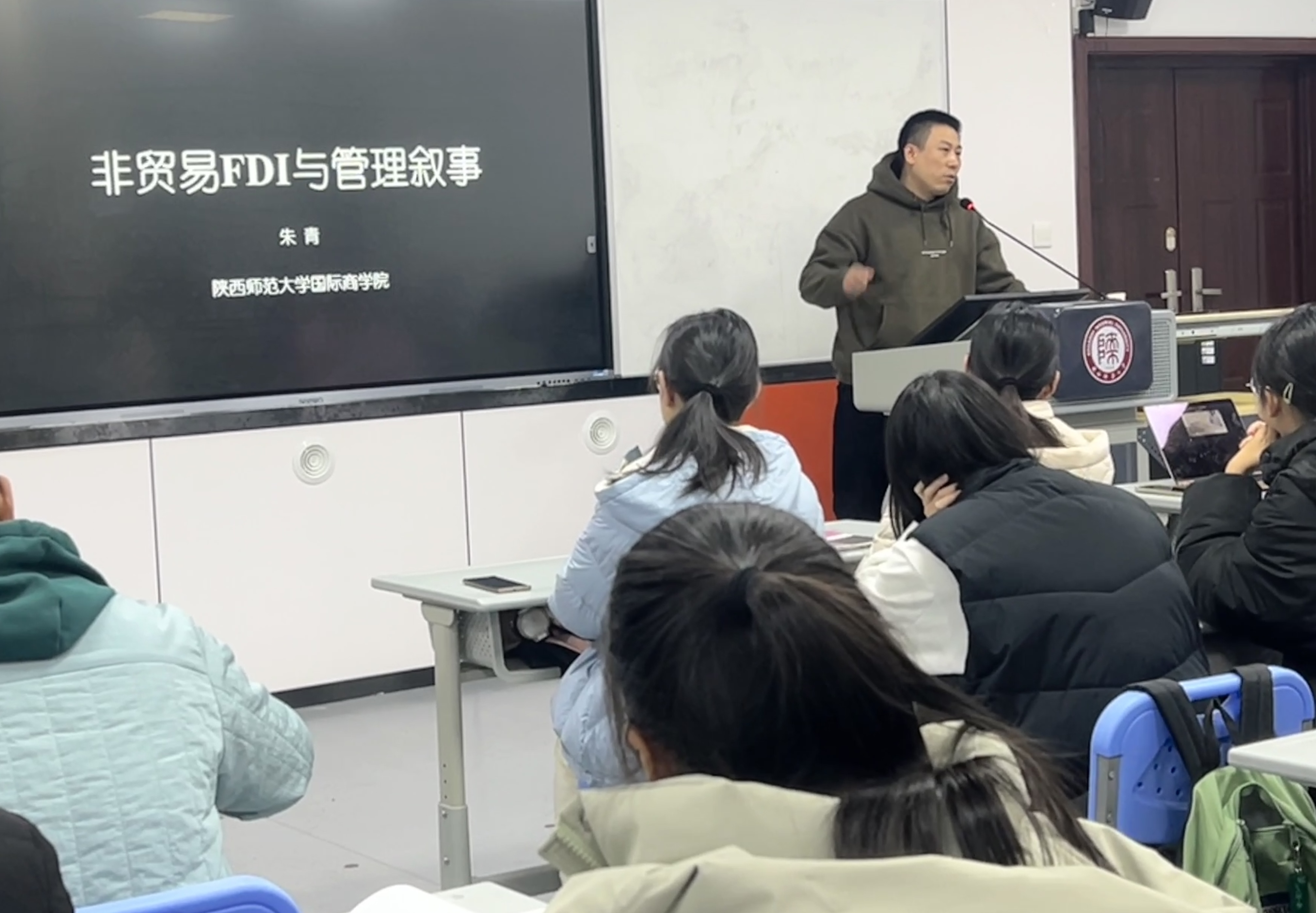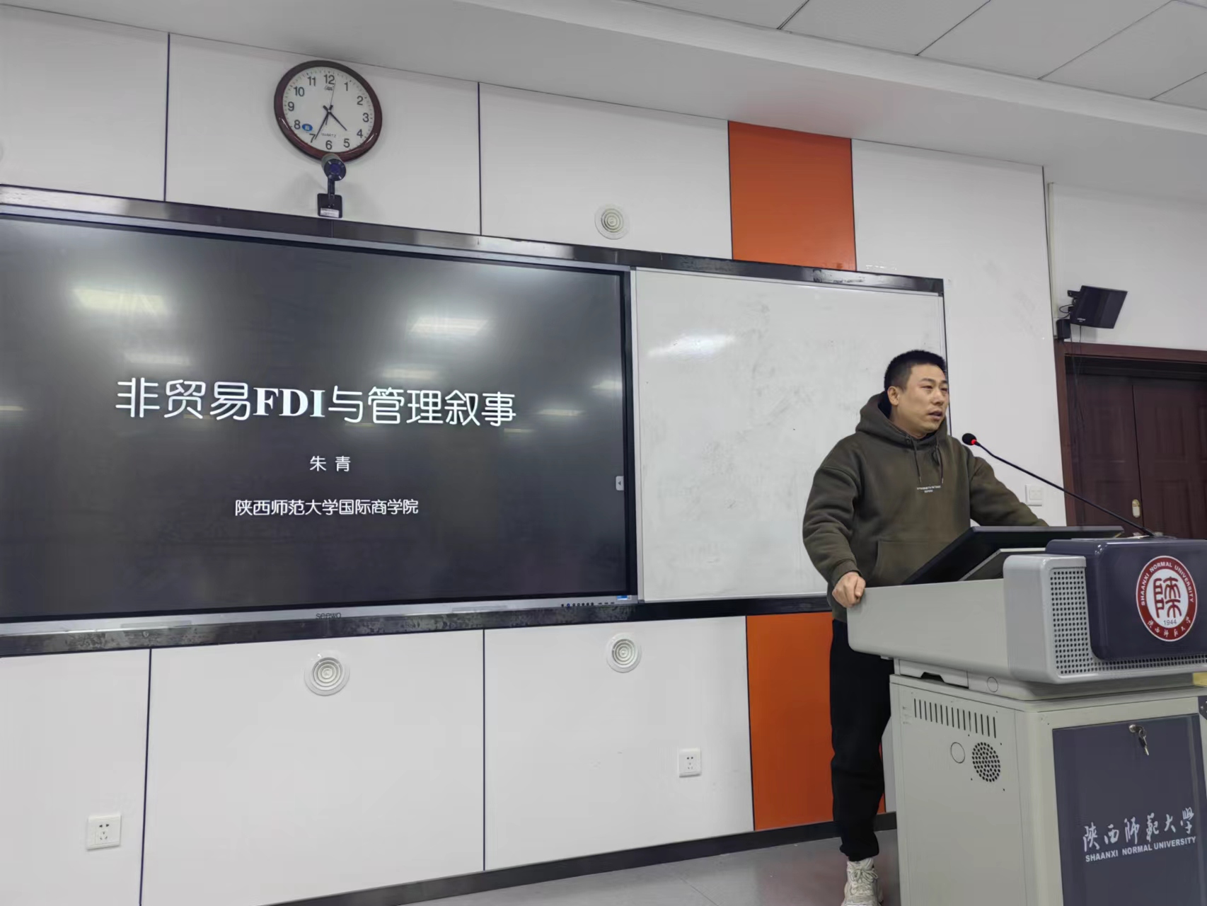 为拓展外语学子的国际视野,培养跨文化管理能力,12月21日下午,学院在6301教室举行了第30期会通讲堂,本次讲座以“非贸易FDI与管理叙事”为主题,特邀西安市青年科技人才、第十四届陕西青年科技奖获得者、beat365国际商学院朱青教授进行主讲。讲堂由鲁燕副书记主持,来自学院全球胜任力与青年发展工作坊及各年级100多名同学现场聆听。